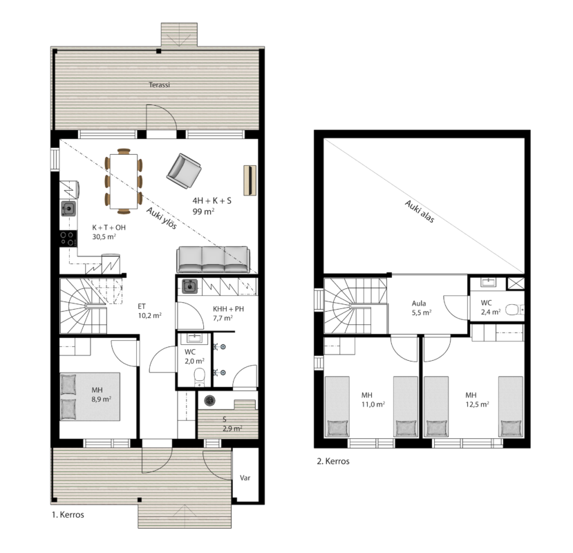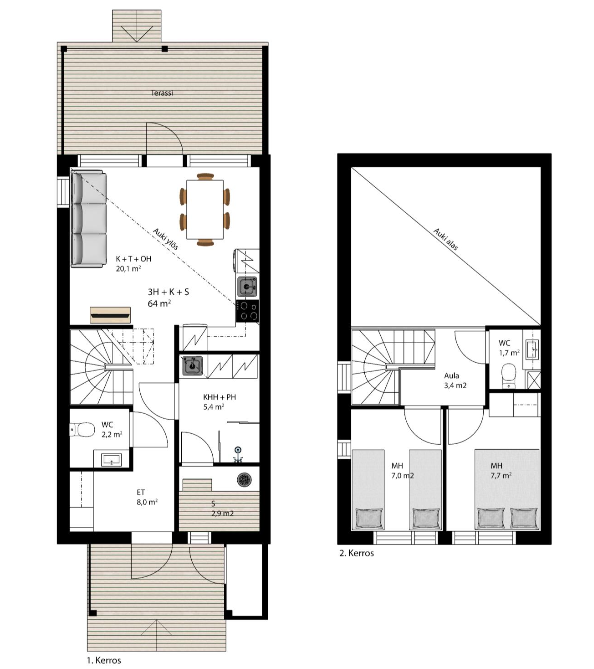 Asuntoja löytyy kahta eri kokoa, joista voi valita itselleen sopivan vaihtoehdon. Isoimmissa asunnoissa makuuhuoneita löytyy kahdesta kerroksesta, kun pienemmässä asunnossa makuuhuoneet on sijoitettu yläkertaan.